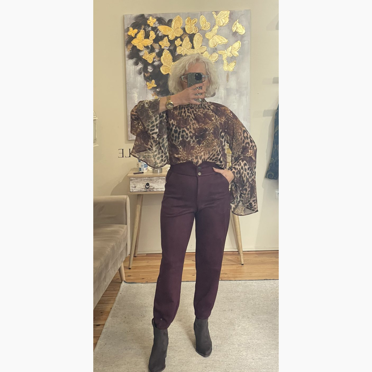 Παντελόνι σουέτ σε μπορντό χρώμα.